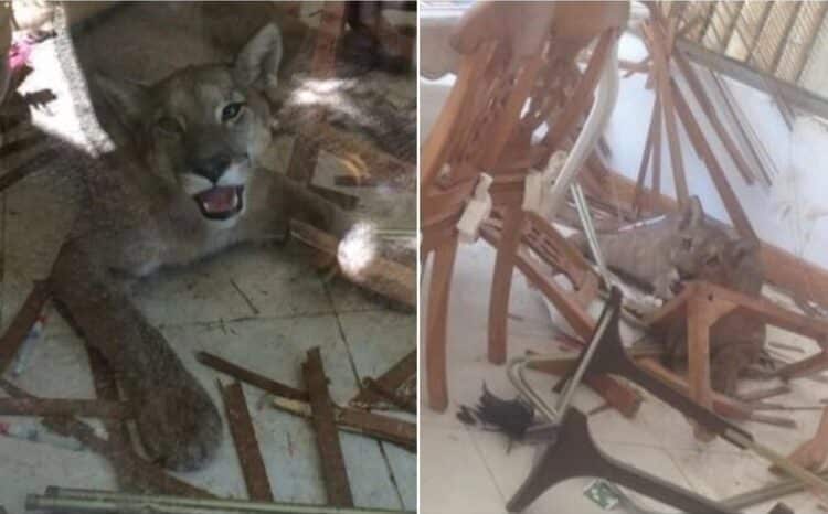 Този инцидент се случи в къщата на жители на град Сантяго, Чили. Те се прибрали и веднага през прозореца видели, че част от мебелите в къщата са унищожени – столове, маса, щори, много вещи просто лежали на пода. Тогава те погледнали по-отблизо и видели, че в средата на целия този хаос лежи дива пума. Не е известно как дивото животно е попаднало в къщата – може би е скочило през прозореца, но собствениците на къщата определено са били шокирани от този неканен гост. Те веднага се свързали с местната служба за спасяване на животни. Персоналът успял временно да приспи пумата със стреличка със сънотворни и да я премести в спасителния център.